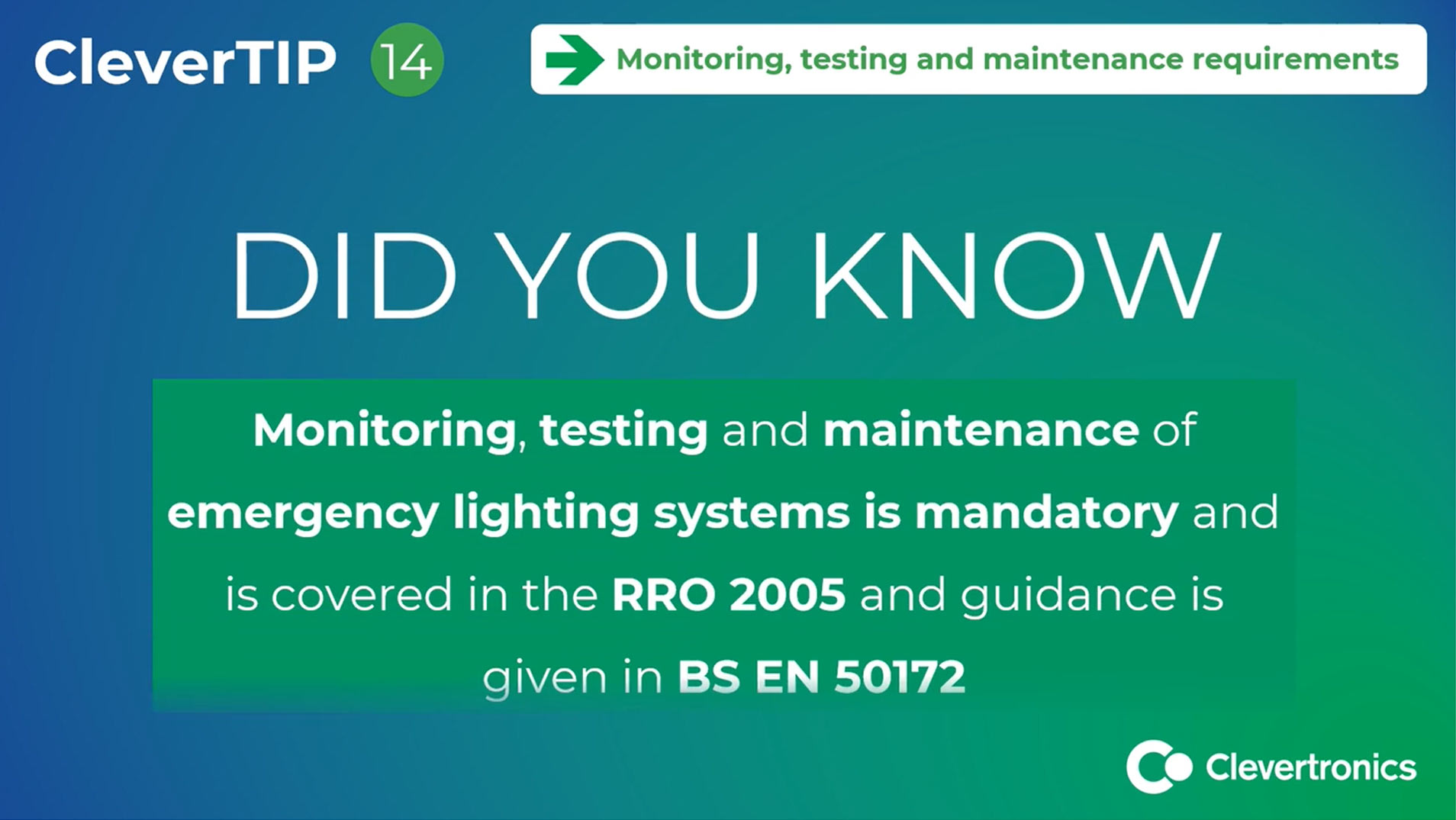 Clevertronics CleverTIPS Clevertronics UK CleverTIP 18: Viewing & Height Distance Find Out More Clevertronics UK CleverTIP 17: Exit Sign Formats Find Out More Clevertronics UK CleverTIP 14: Monitor Test Requirements Find Out More Clevertronics UK CleverTIP 12: Electronic Doors Find Out More Clevertronics UK CleverTIP 11: Points Of Emphasis - Safety Equipment (2) Find Out More Clevertronics UK CleverTIP 8: Points Of Emphasis - Corridors and Direction Find Out More Clevertronics UK CleverTIP 5: Points Of Emphasis - Doorways Find Out More Clevertronics UK CleverTIP 4: Rooms Requiring Emergency Lighting Find Out More Clevertronics UK CleverTIP 3: Emergency Lighting Illumination Find Out More Clevertronics UK CleverTIP 2: Exit Sign Mounting Heights Find Out More