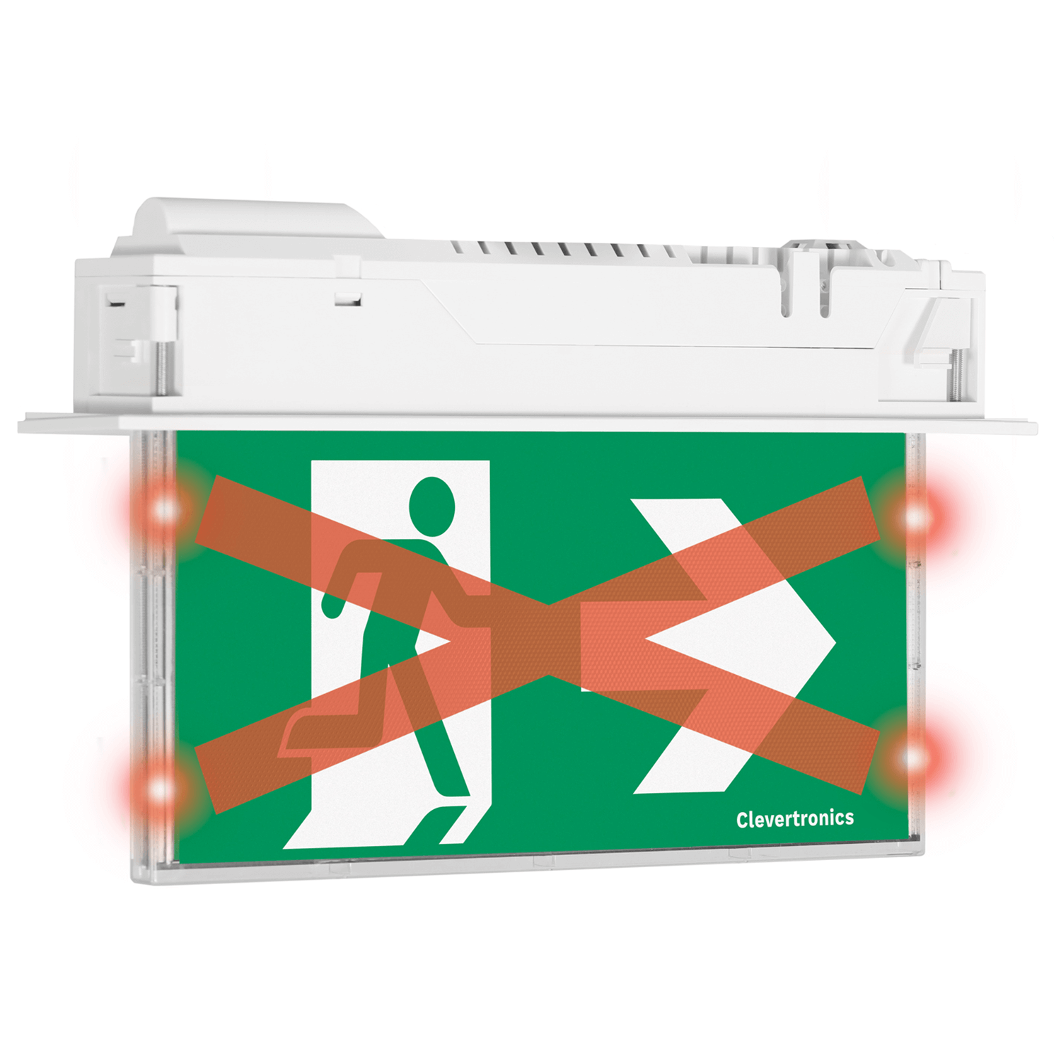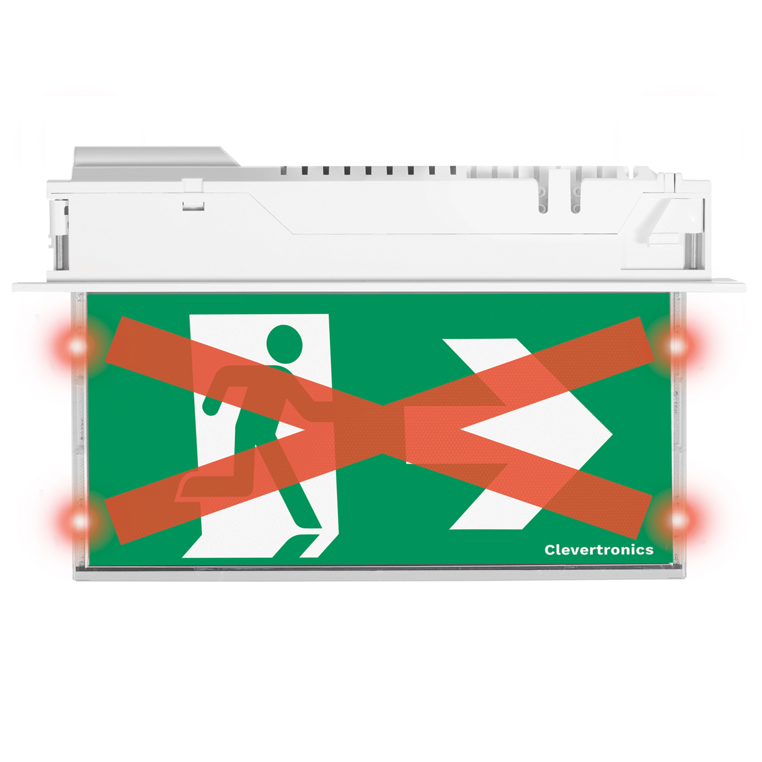 The CleverEVAC Dynamic RED X sign can display a red cross with flashing corners, alerting those evacuating to seek an alternative exit. Using advanced lighting and printing technology, the red cross with flashing corners has been proven through the Fire Safety Engineering Group (FSEG) research to be intuitive and effective in demonstrating negative enforcement. The sophisticated look and design of the blade will satisfy all architectural requirements and is available as a recessed or surface mount unit.